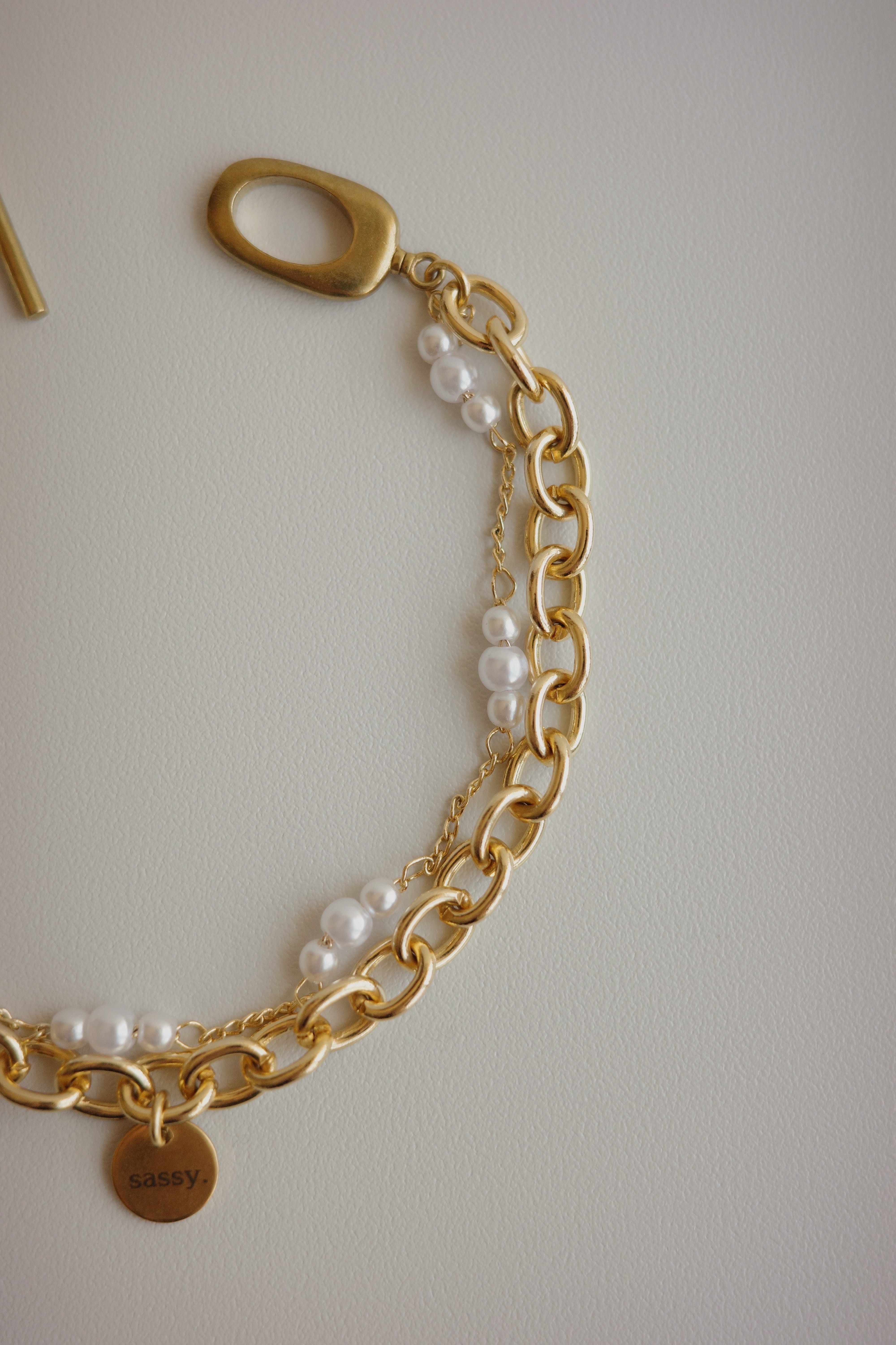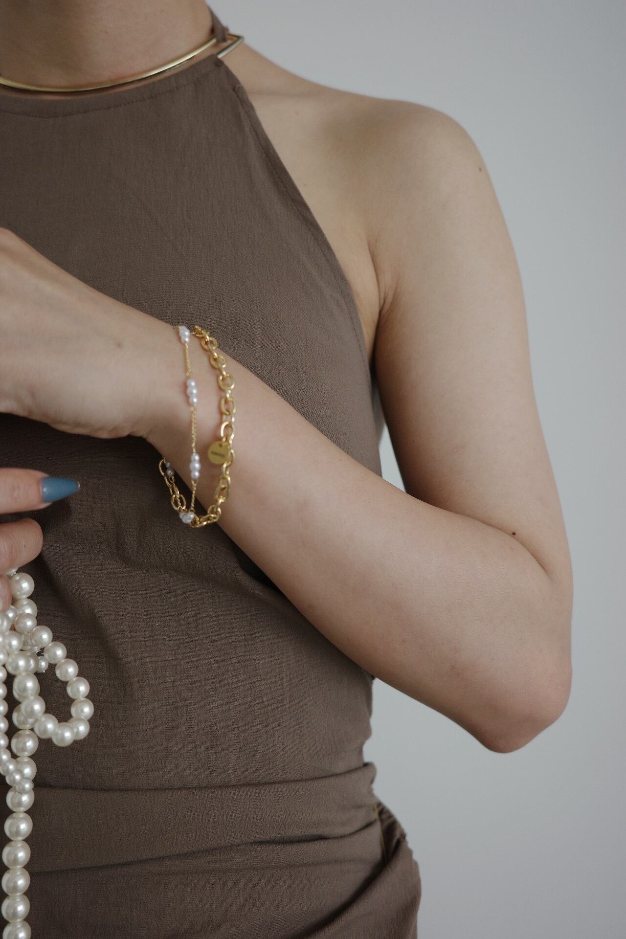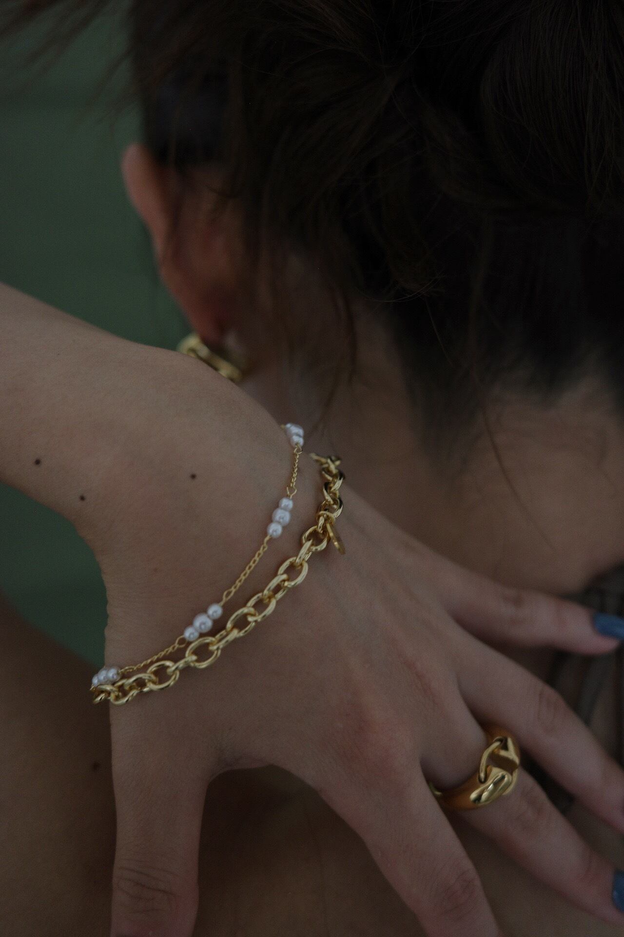 無骨な太めチェーンと繊細なパールチェーンを組み合わせた、存在感のあるブレスレット。