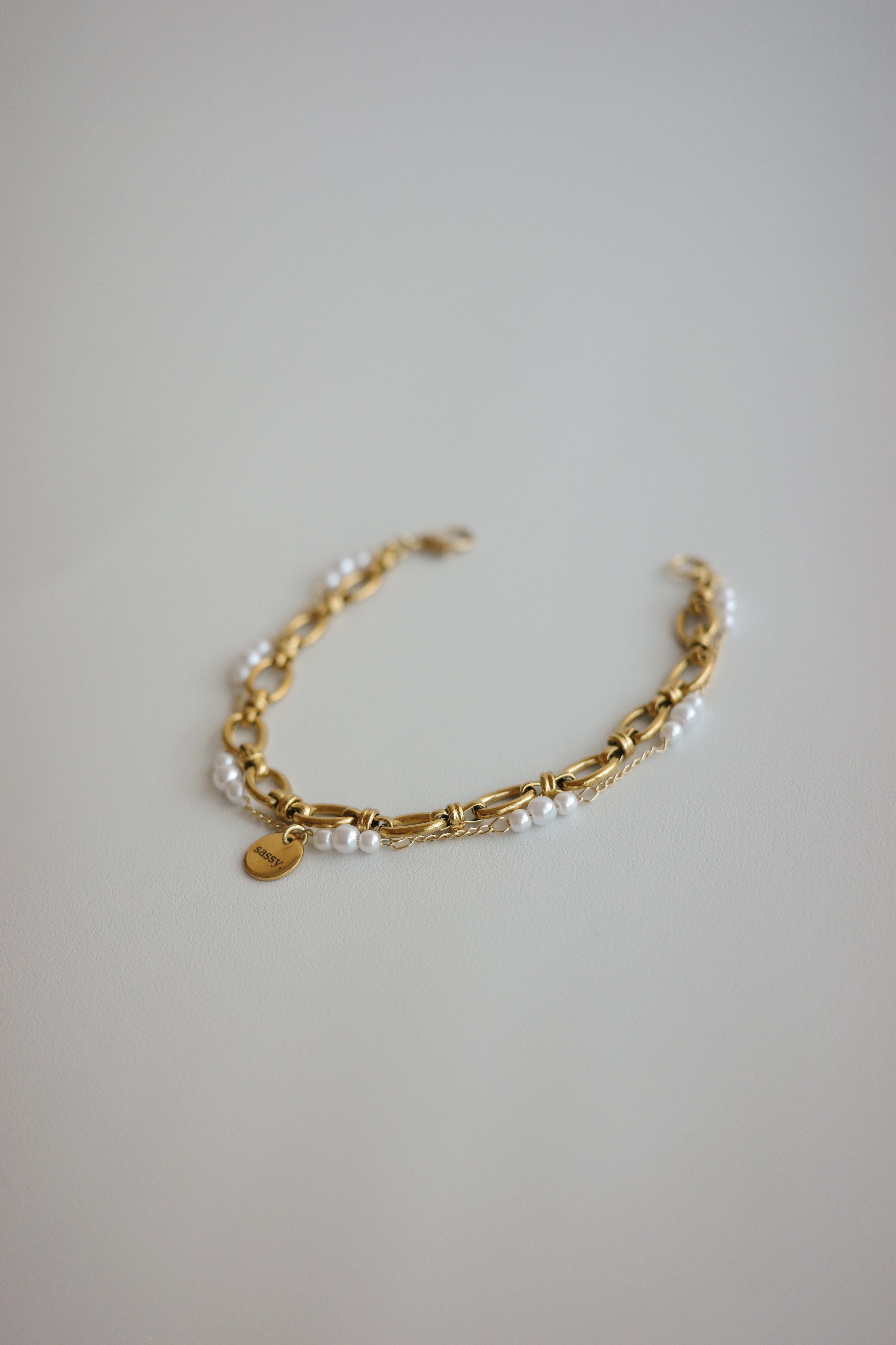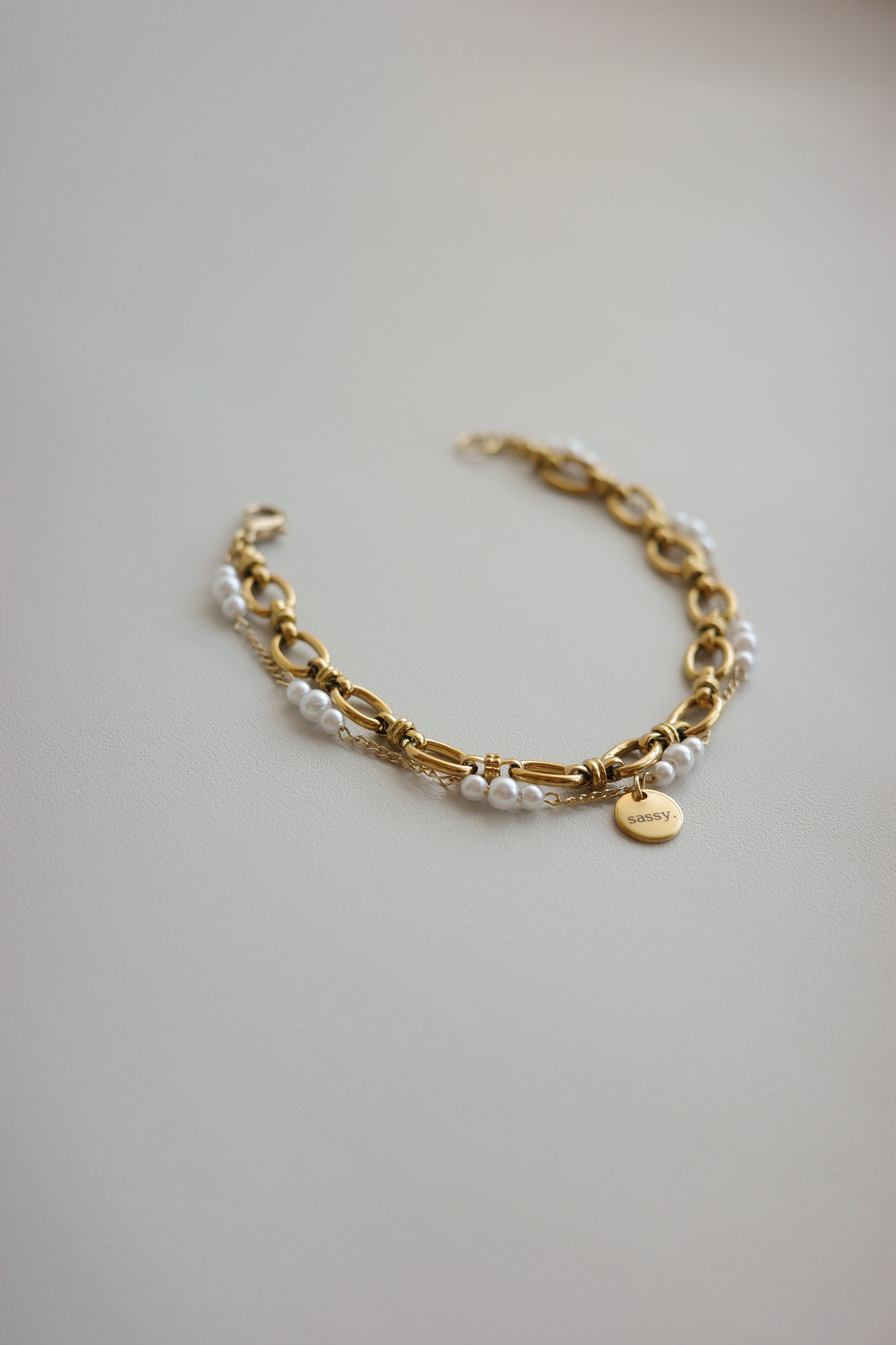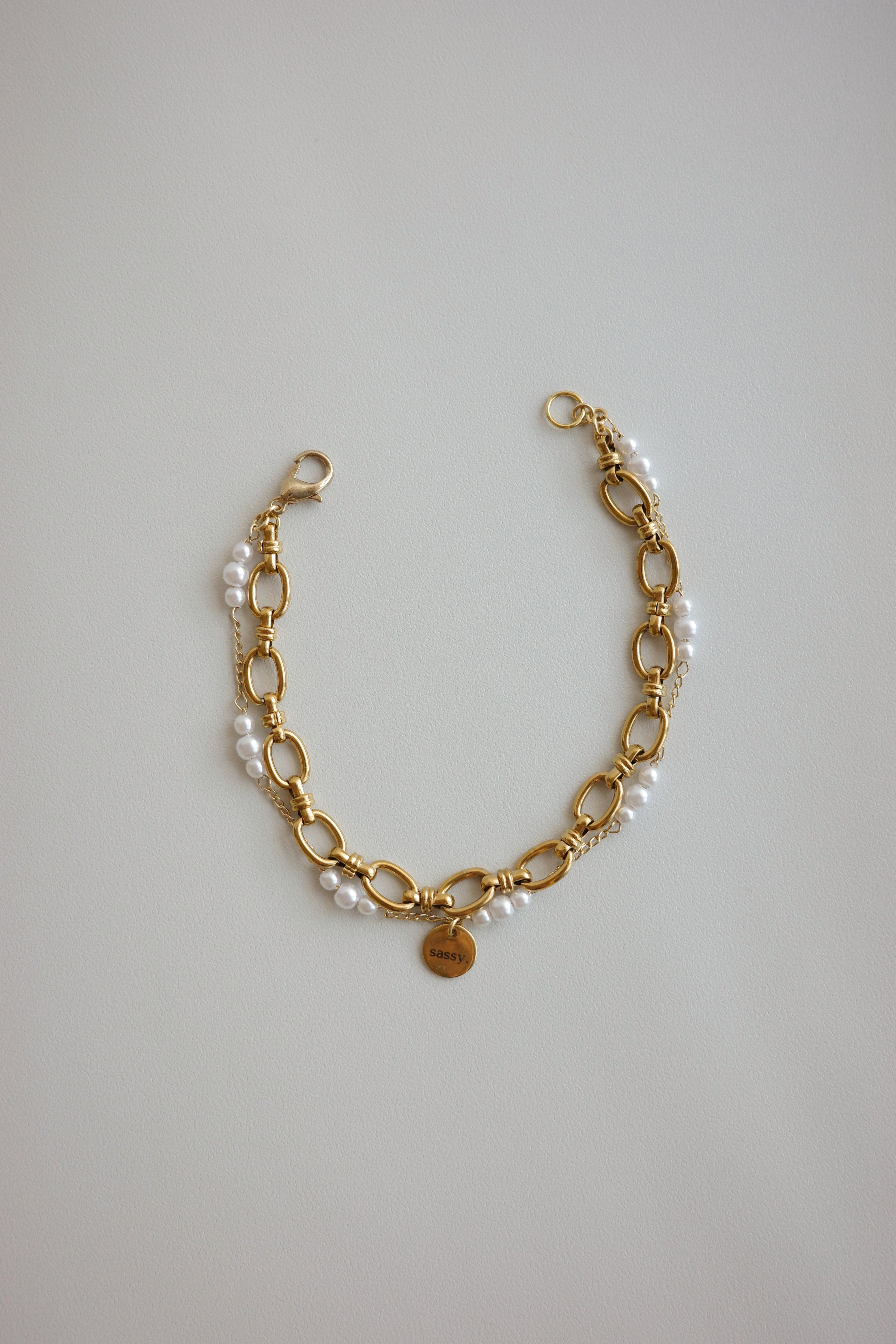 無骨な太めチェーンと繊細なパールチェーンを組み合わせた、存在感のあるブレスレット。