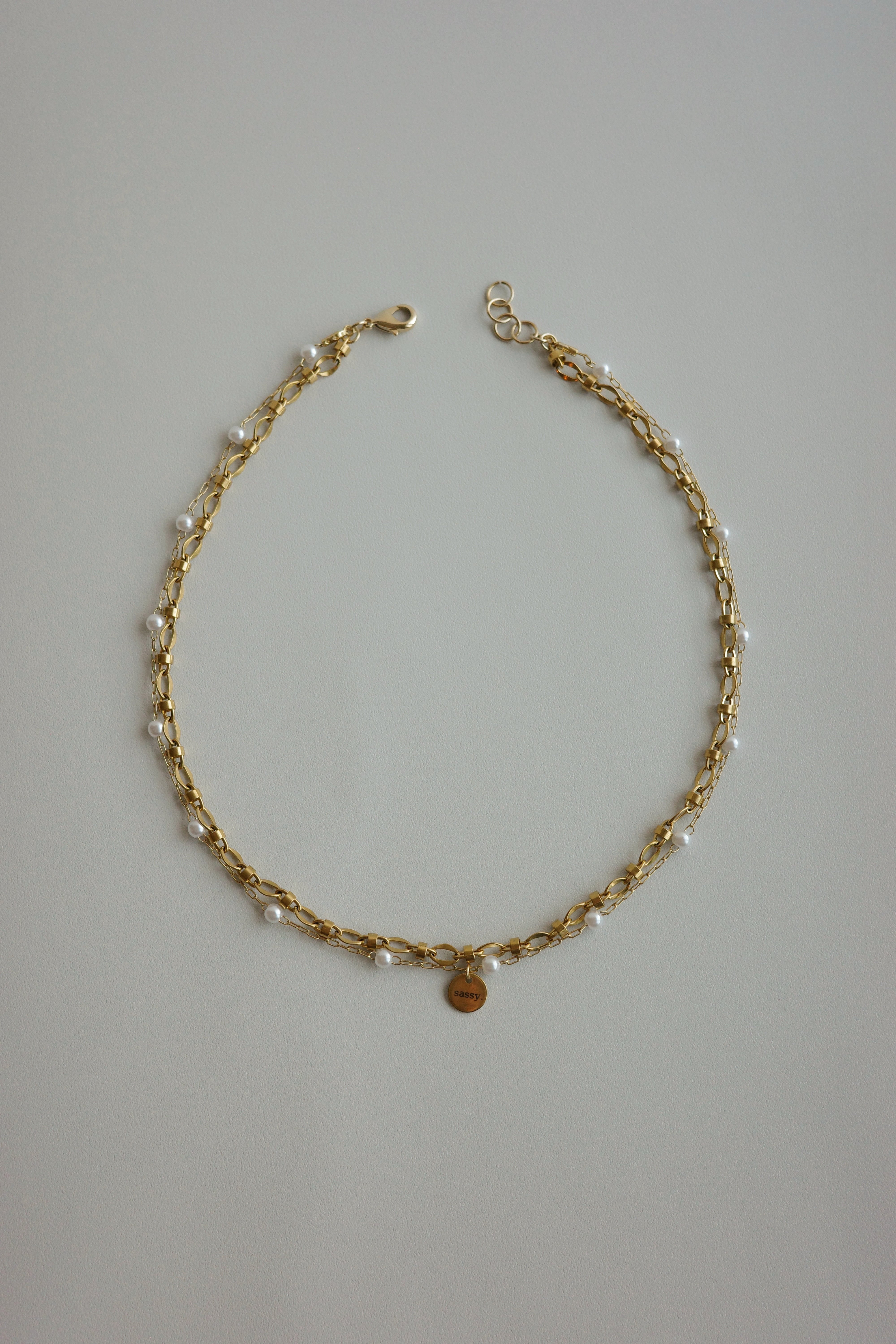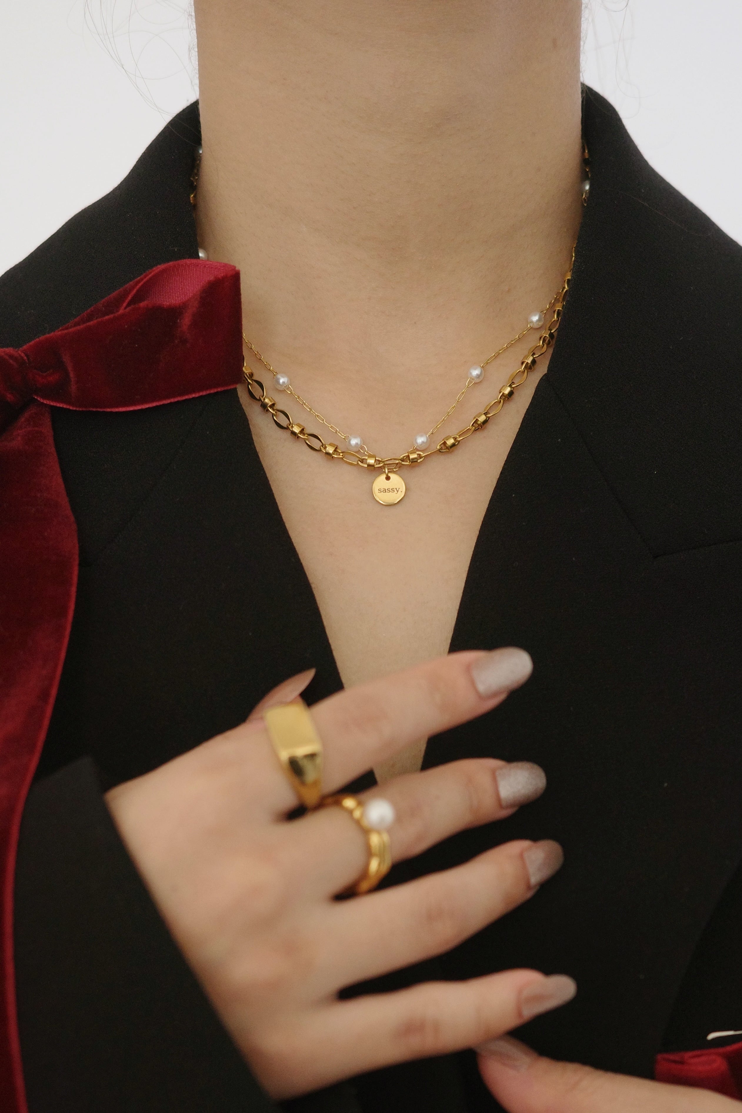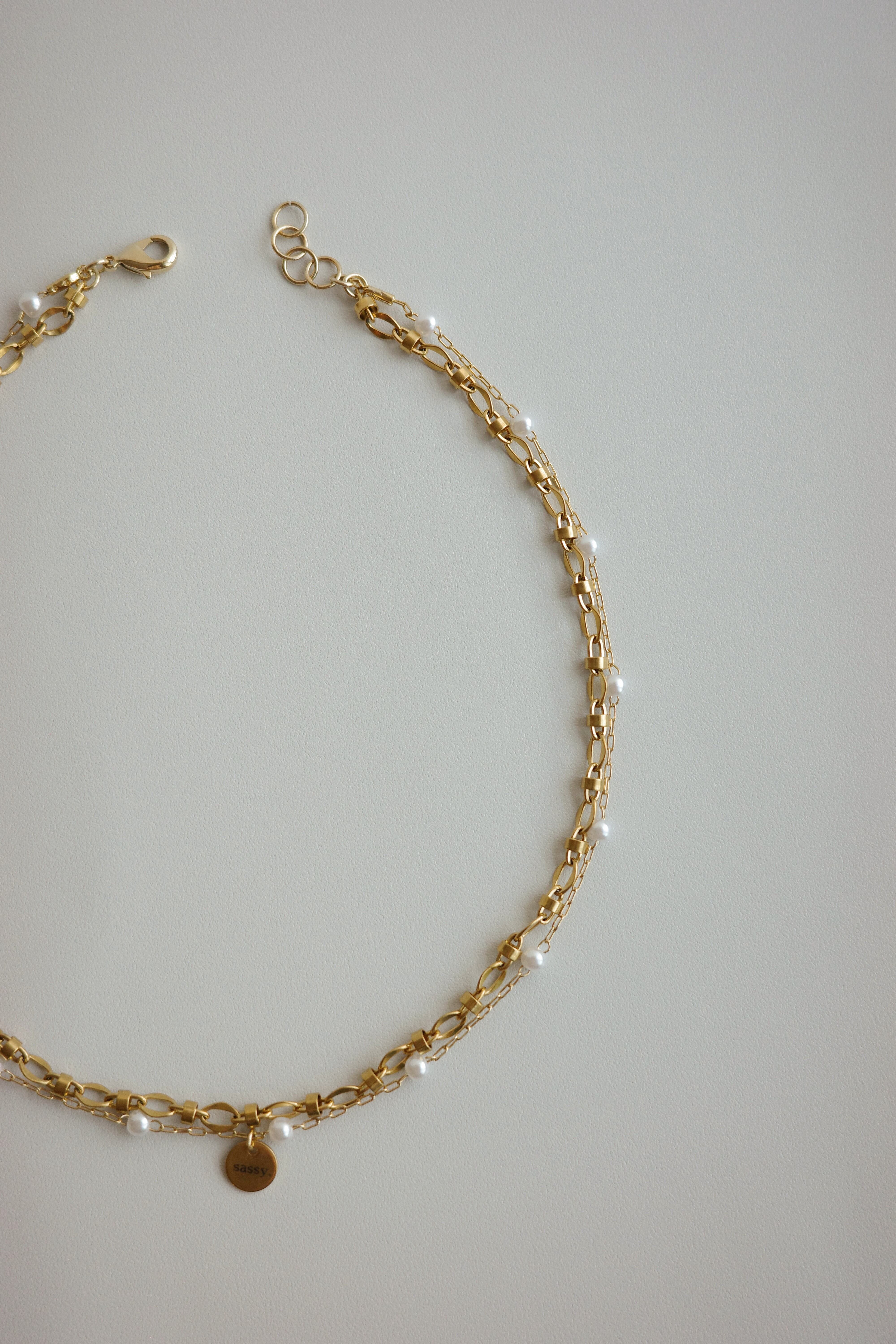 繊細なパールチェーンを組み合わせた、存在感のあるネックレス