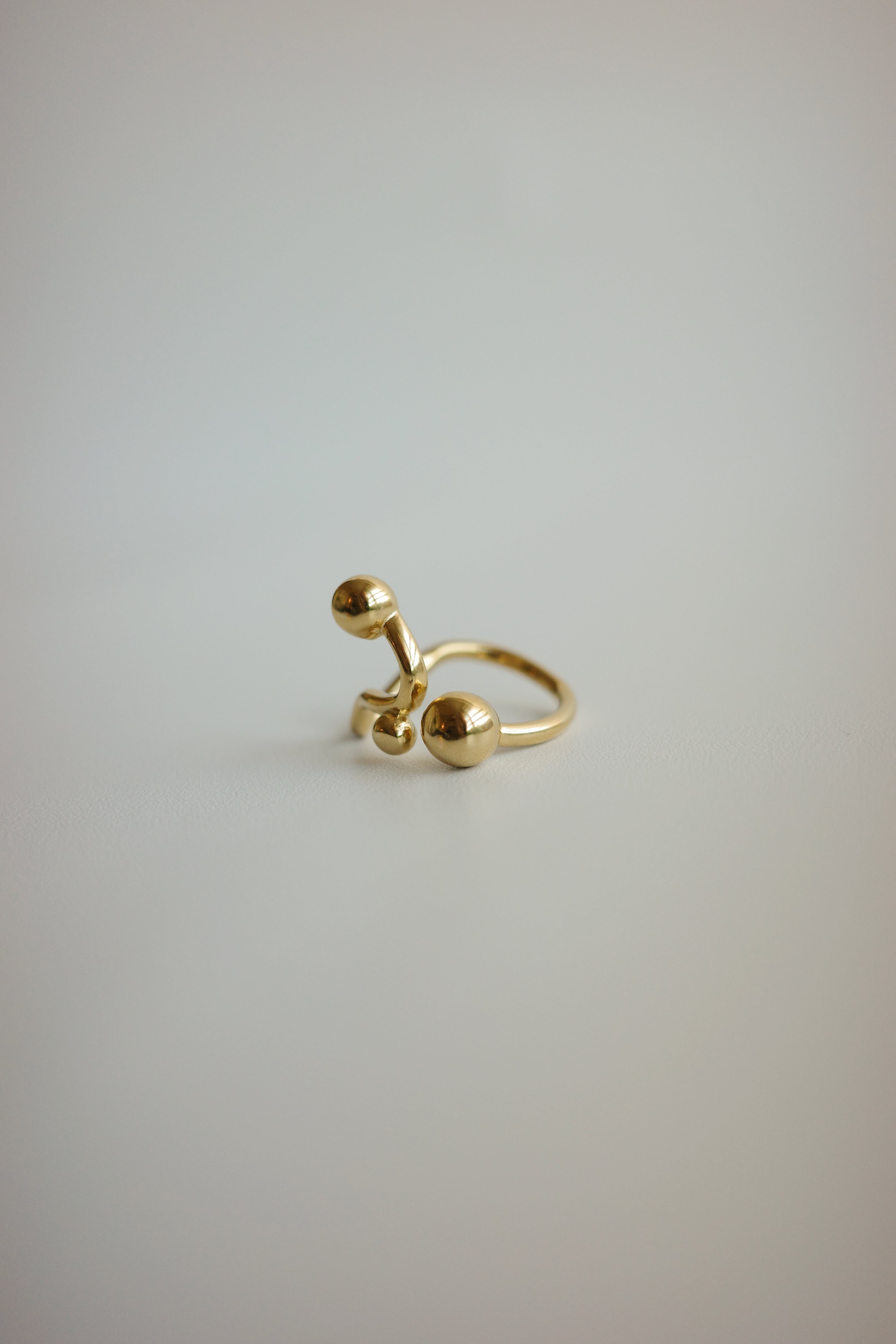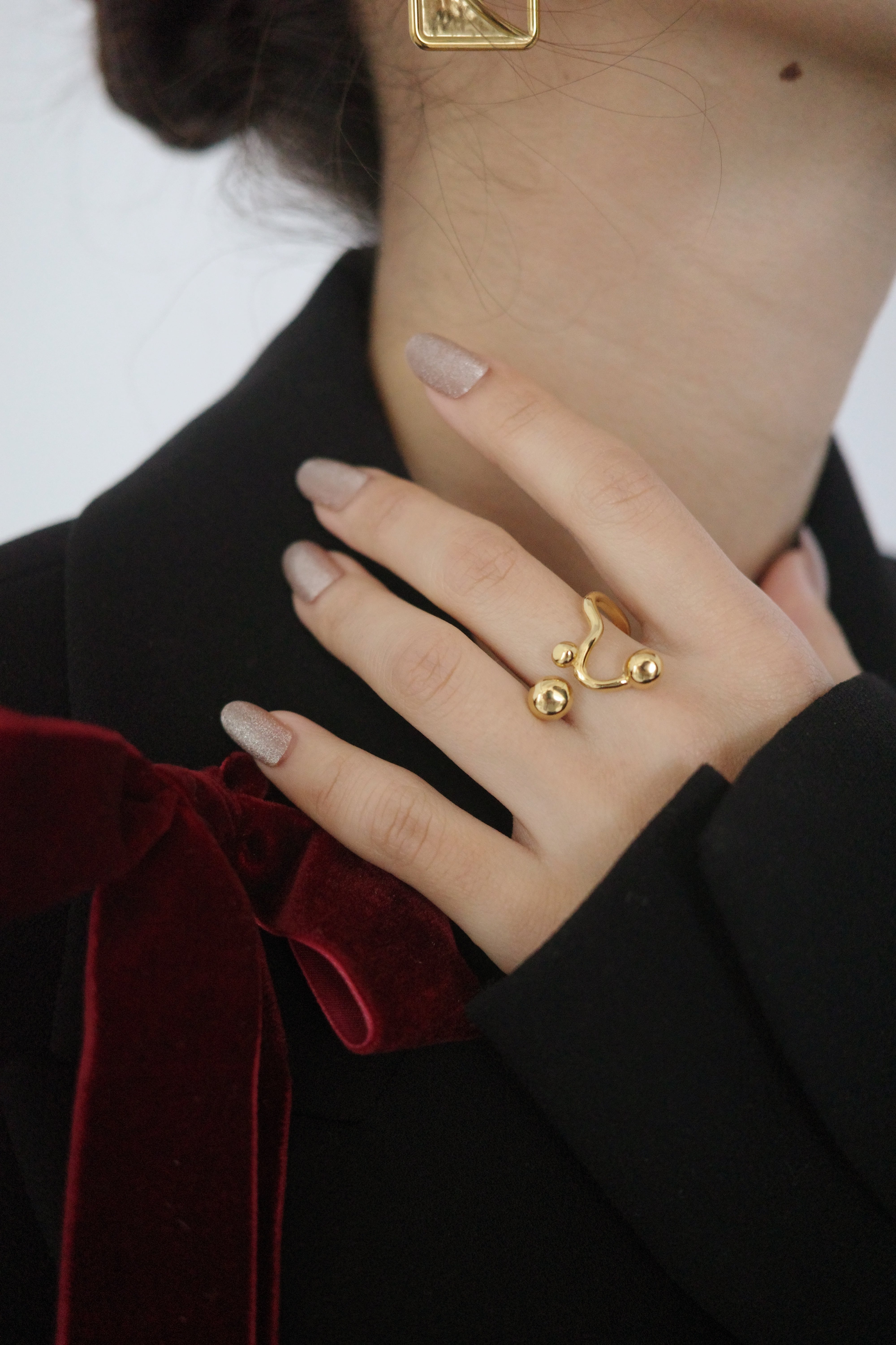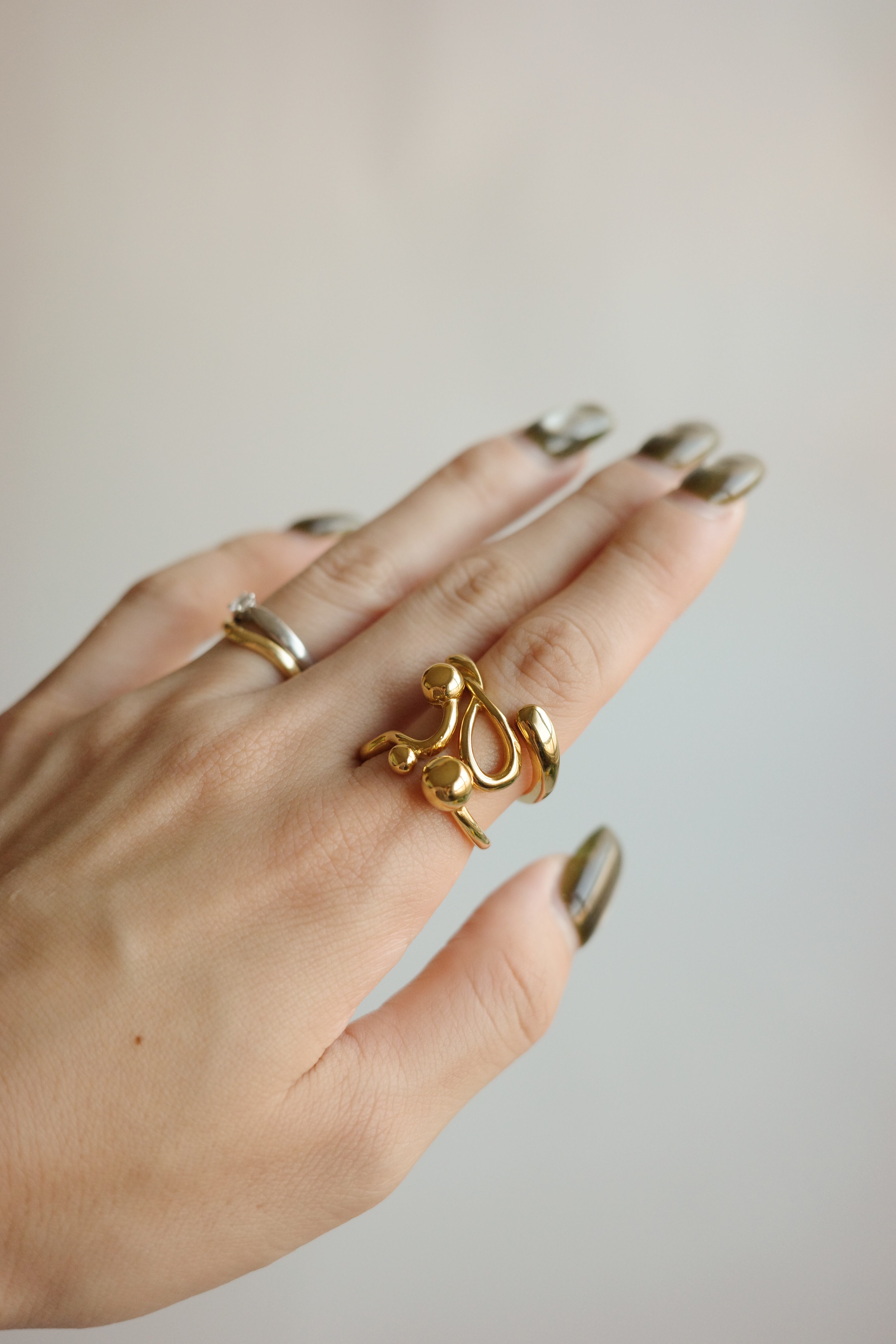 指に纏うだけでスタイリングが一段階ドレスアップされる、アートな存在感を持つリング。